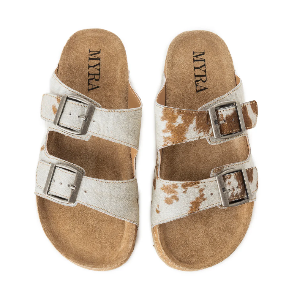 Myra Restful Hairon Leather Slides for Women – Adjustable Straps, Cork Footbed & Stylish Dual Buckle